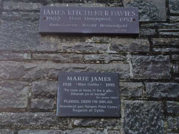 Two memorials can be seen on the walls. One for James Kitchener Davies (1902–52), who was born at Y Llain. He was a nationalist and a Christian, and after moving to the Rhondda he became a prominent figure greatly influencing Welsh-medium education in the Valleys. To gain an insight into his early childhood one should read his poetic drama Meini Gwagedd. The other memorial is to Mari James (1918–2005), deacon, leader and instigator of many activities at Llwynpiod.